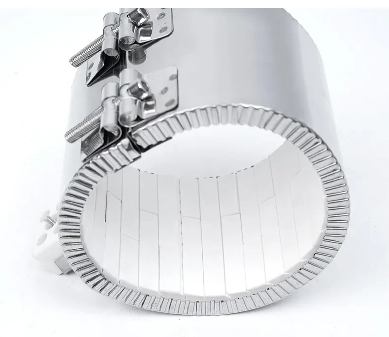 Хомутовые керамические нагреватели представляют собой изделие состоящие из специальной резистивной проволоки, которая в виде спирали находится внутри керамического изолятора. Изделие, имеющее форму кольца, помещено в прочный корпус из нержавеющей стали. Кроме того, бывают нагреватели, изготовленные из двух полухомутов или даже нескольких сегментов.